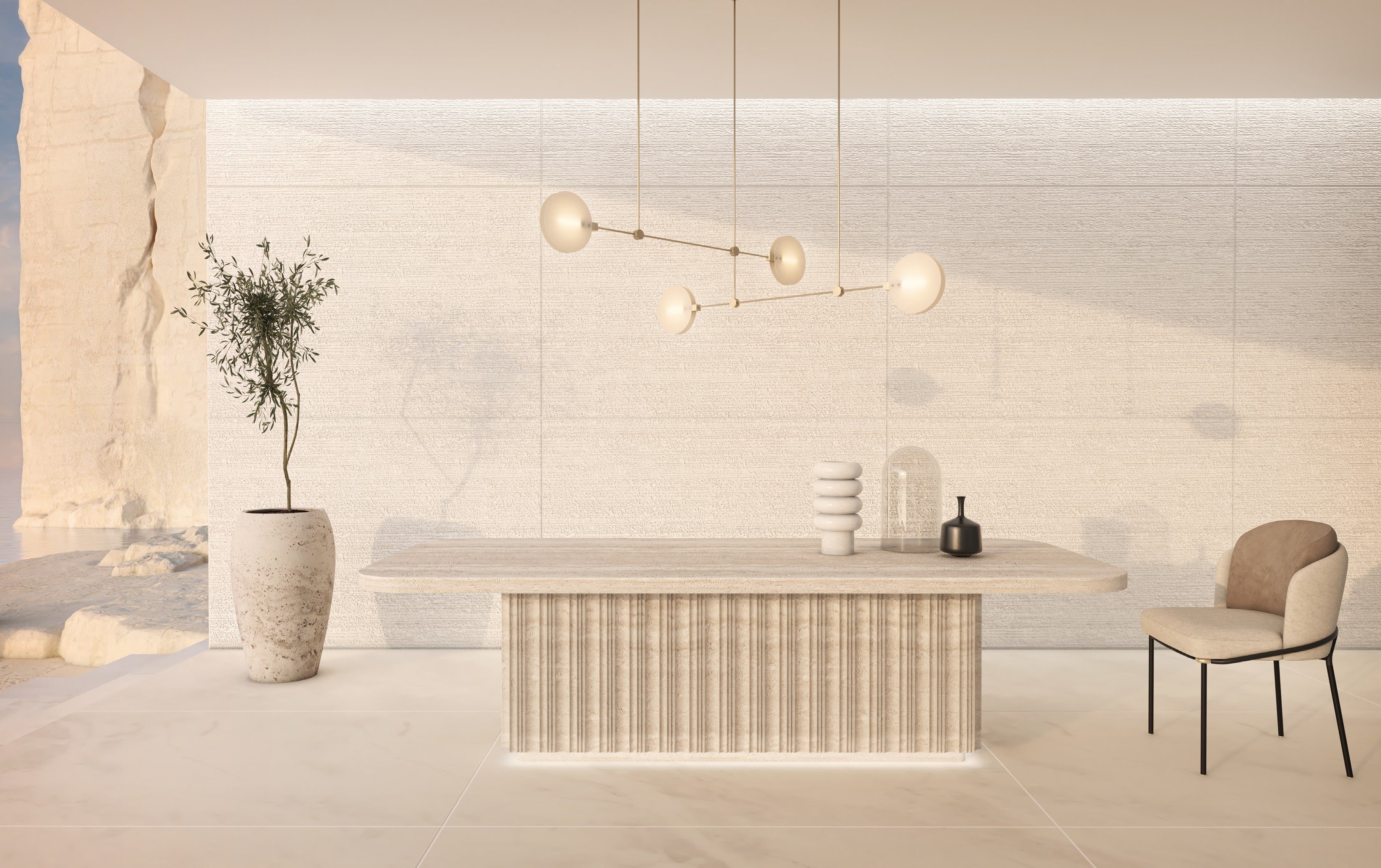 The sleek expanse of its stone surface appears to float lightly over a sculptural base, the whole inspired by the ripples of water and the natural imperfections that are created by nature when water meets stone. It is made to appear more weightless still by gentle underlighting at the floor.